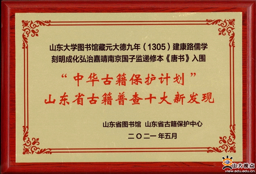 山东大学图书馆馆藏元大德九年(1305)建康路儒学刻明成化弘治嘉靖南京国子监递修本《唐书》渊源有自,传承有序,初为清代著名学者王念孙藏书,后经民国间山东著名藏书家赵录绩、曹善揆递藏,于解放后归藏山东大学图书馆。在古籍普查中,图书馆发掘其珍贵的版本、文献价值,申报并入选山东省第二批珍贵古籍名录和第二批国家珍贵古籍名录。
