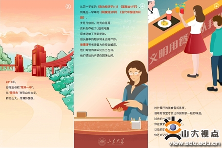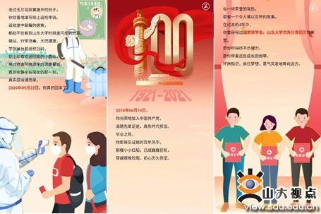 从第一篇章开始,H5展现学生从初入校门到毕业期间的点滴回忆,涵盖入校报到、军训、开学典礼、课程、教师、辅修专业、校外交流、图书借阅、社会实践、文体活动、网络、校园卡消费、宿舍、政治面貌、个人奖励、疫情期间的特殊记忆等各方面信息。最后一个篇章中,学校党委书记、校长、学院领导、任课老师和辅导员为毕业生送上了殷殷嘱托和真挚祝福。H5中,毕业生不仅可以回味有本人各类数据记录的大学生活,还可以看到以自己所在校区真实建筑为背景设计的艺术插画,不仅可以听到《我的山大我的家》校友之歌,读到毕业寄语,还可以收到师生们送上的即时祝福,引发强烈的情感共鸣。毕业生们也纷纷在留言板上写上了自己对母校、师生的感激、不舍和祝福,感情真挚,令人动容。