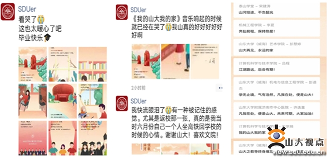 毕业生在留言板中纷纷表达了对母校的感激与眷恋。土建与水利学院马震林表示,山大情就像温馨的港湾,不管我们身居何位,回到母校怀抱时依旧是从前那个少年。经济学院修晓琳感叹,在山大,我们接受教育,获取知识;教室的专注、图书馆的静谧、操场的汗水、食堂的餐食乃至路过的老猫,都使我们成为更加坚毅、更加善良的人。空间科学与物理学院杨玉洁感叹,非常幸运能够在美丽的山大度过了最快乐的四年青春。四年芳华,良师益友一路相伴,所遇之人皆为良善,千言万语汇成一句感谢。在此山大百廿之际,祝愿母校积历史之厚韵,再谱华章。