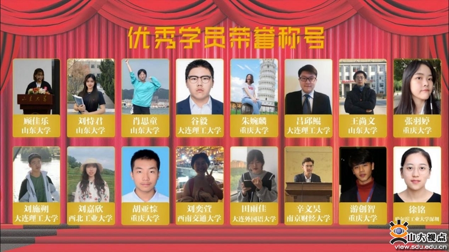 本次闭幕式以“Future Star Online Talent Show”展开,来自全国7个高校的同学进行了个人风采展示。其中,山东大学顾佳乐同学与其他高校同学合唱的《没什么不同》赢得了大家的掌声。祖良荣先生强调,GYLA是一个资源共享的平台,其目标是培养未来国际青年领袖精英。GYLA的成功和成就离不开同学们的付出、梦之队成员的努力,以及高校和专家团队的支持。他宣布了本期GYLA的优秀学员和杰出贡献奖名单,山大顾佳乐、肖思童、刘恃君、王尚文共四位同学获优秀学员奖,李超群、宋欣蔚、鲁嘉懿共三位同学获杰出贡献奖。