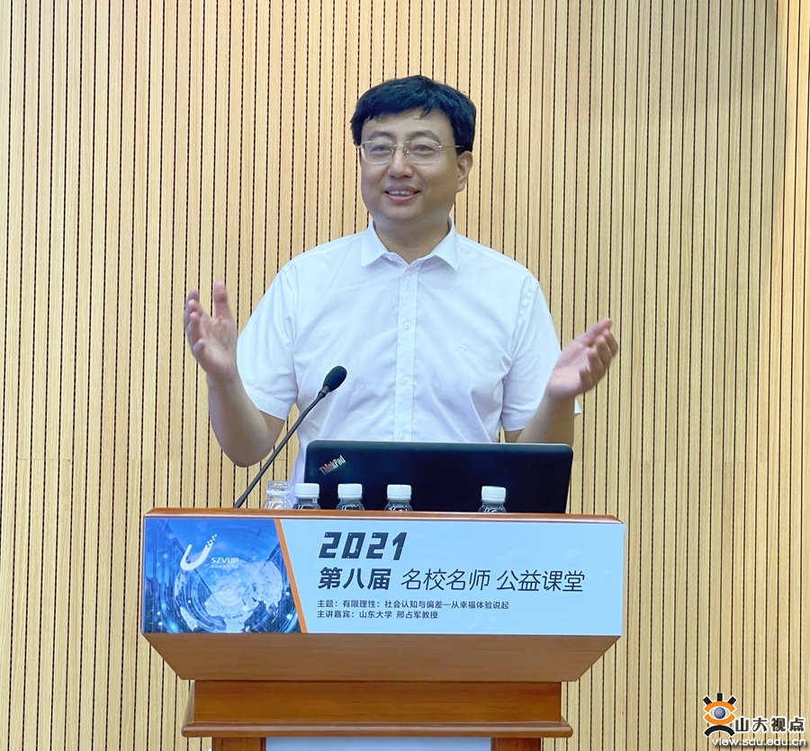 [本站讯]近日,深圳虚拟大学园第八届名校名师公益课堂山东大学专场在虚拟大学园重点实验室平台大楼举行。此次公益课堂由深圳市科技创新委员会、深圳市科技创新战略研究和技术转移促进中心主办,山东大学深圳研究院承办。山东大学校长助理邢占军以“有限理性:社会认知与偏差——从幸福体验说起”为题作讲座。深圳市科技创新战略研究和技术转移促进中心副主任陈蓉、高级工程师陈焱,山东大学深圳研究院常务副院长王明星、副院长傅杰,香港理工大学深圳基地CEO陈绮东出席活动,此次活动由山东大学深圳研究院教育培训部副部长董玲琳主持。