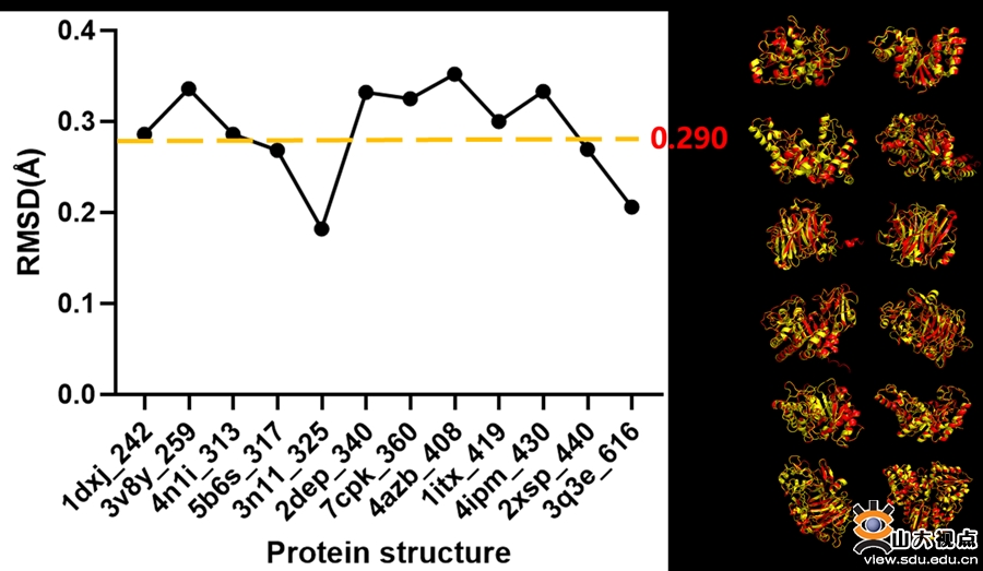在AlphaFold2软件测试的过程中,选择了来自12个不同家族的蛋白质作为批量测试目标。根据已知结构,测试样本中含不同二级和超二级构象,序列长度分布在200~500个氨基酸,总耗时约10小时。将预测结构与实验测得的蛋白质结构进行结构比对后,得到RMSD(Root Mean Squared Error)的平均值为0.290。