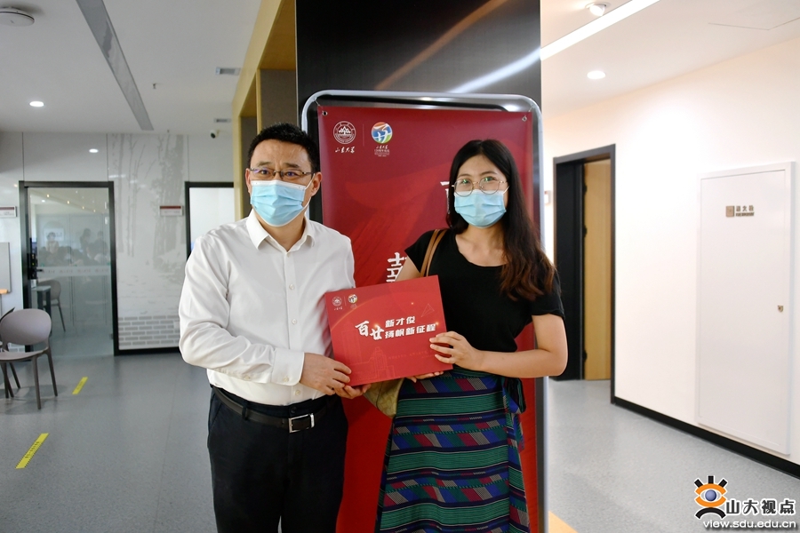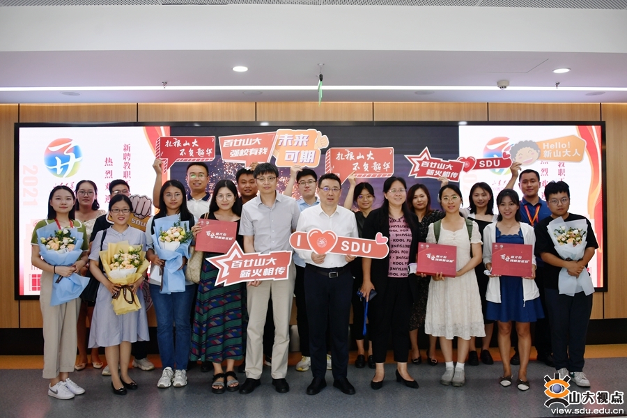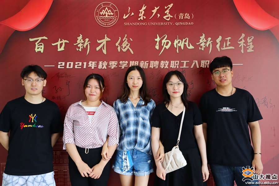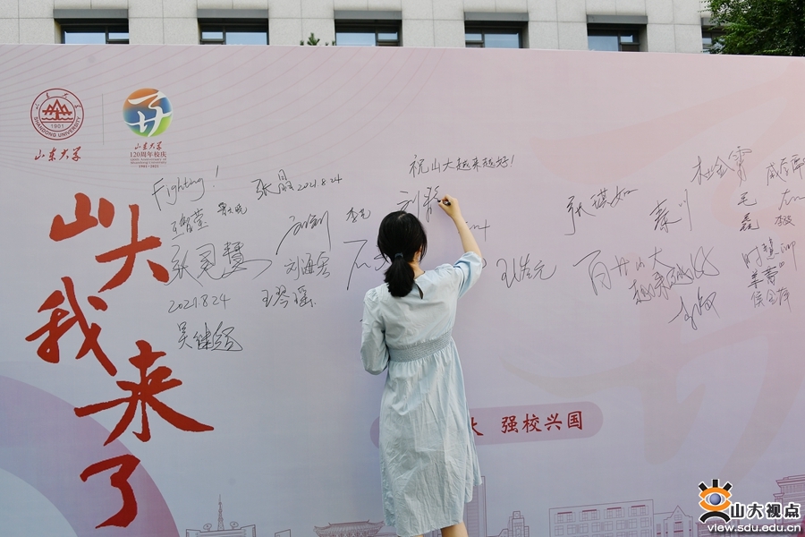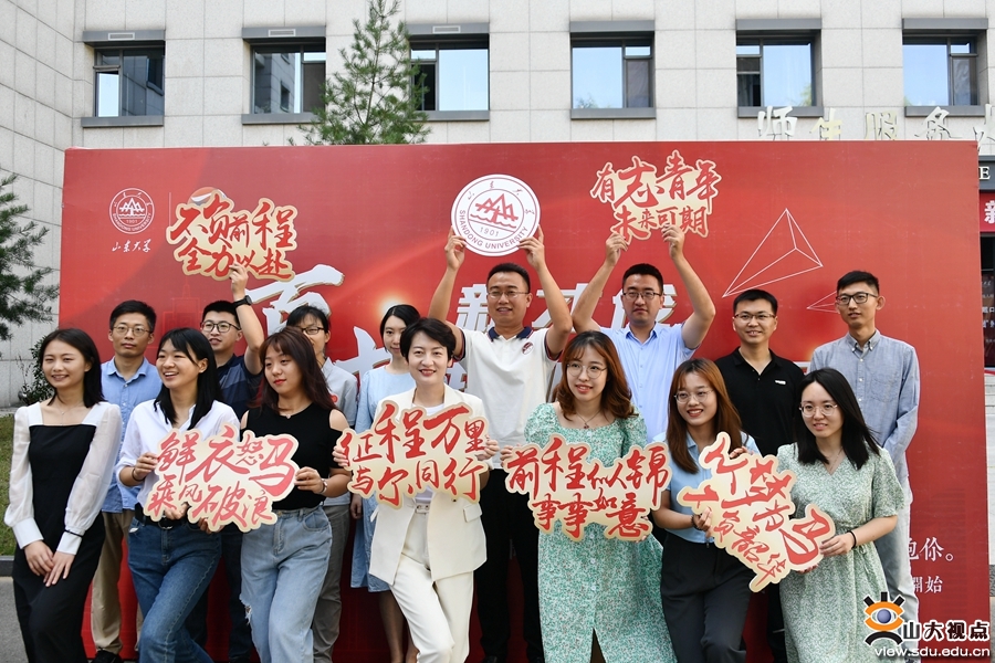 在欢迎背景墙前,新教工纷纷手拿祝福板和鲜花束进行合影,为自己在山大的起航作留念;在签名墙前,大家签好自己的名字,隆重写下迈入山大的第一笔,为自己和山大的明天喝彩,为山大双甲子生日祝福。