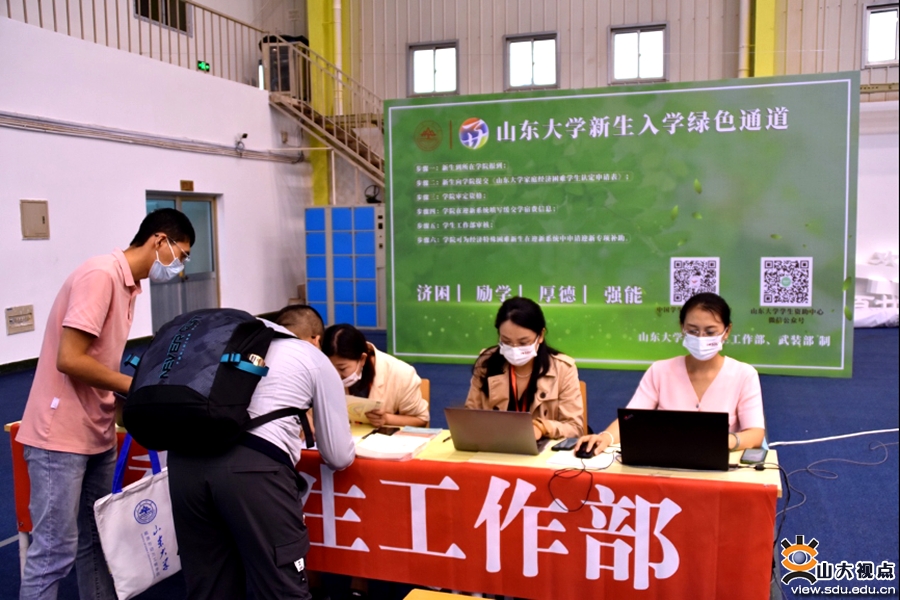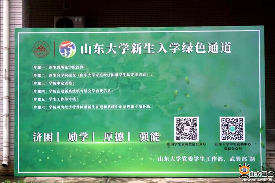 开通“绿色通道”,温馨关怀,服务到位。学生资助中心按照学校疫情防控的总体部署,抓实抓细“绿色通道”各项工作,帮助经济压力较重的新生暂缓缴纳学费直接报到,顺利入学之后通过申请国家助学贷款、助学金、勤工助学等方式来缓解经济压力。除办理缓交学费之外,学生资助中心还为家庭经济困难的本科新生准备了总金额最高达1600元的“爱心能量包”,包含临时困难现金补助、爱心被褥券、爱心生活券、军训服装券等,缓解学生开学之初学习生活压力。山东大学学生资助中心还在现场集中展示了国家资助政策、学校奖助体系和近年来资助成果,为家庭经济困难学生提供在校期间助学成才的途径,帮助家庭经济困难新生尽快树立克服困难的信心。