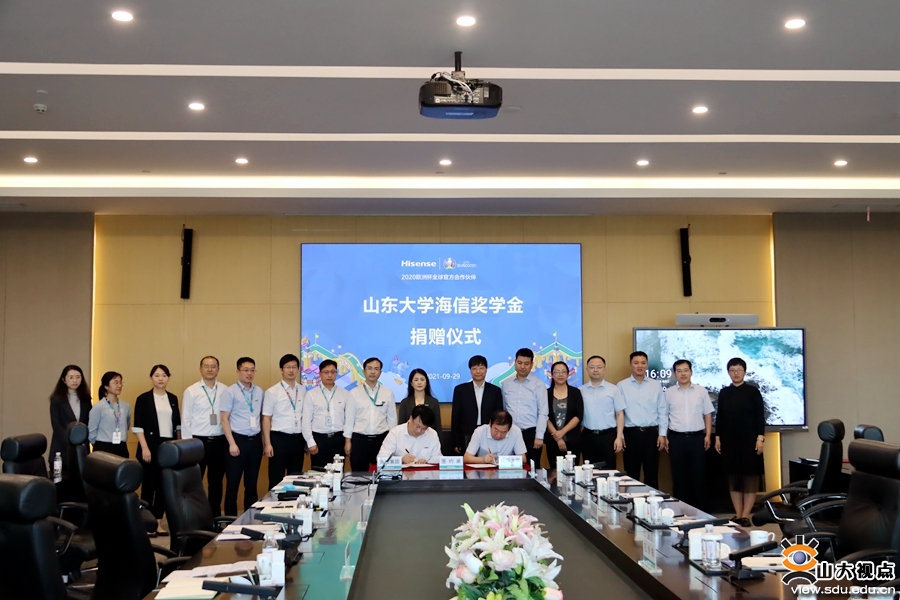 [本站讯]9月29日下午,山东大学与海信集团座谈会暨奖学金捐赠签约仪式在海信集团控股股份有限公司举行,校企双方重点围绕人才招聘及交流活动、管理项目合作、技术项目合作等方面进行深入交流。青岛校区党工委书记孔令栋、常务副校长韩建新,海信集团高级副总裁陈彩霞、高级副总裁陈维强出席活动。海信集团有关负责人,校区党工委(校长)办公室、学生工作部和相关学院负责人参加活动。