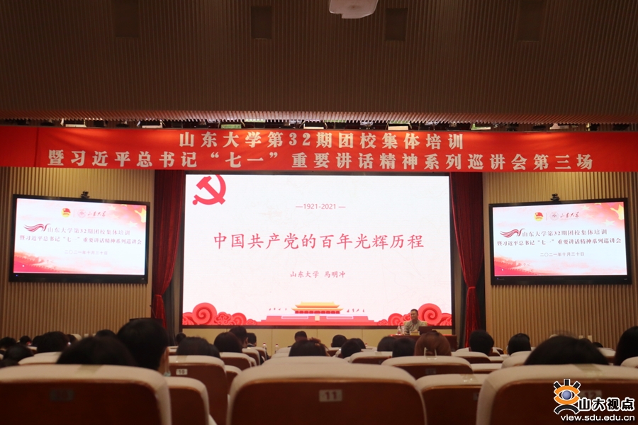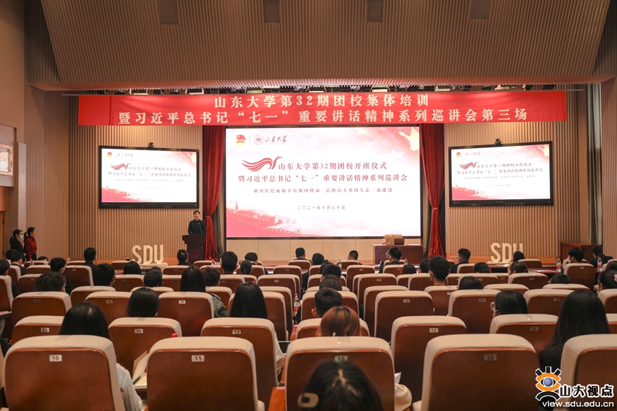 [本站讯]为认真学习习近平新时代中国特色社会主义思想,深入贯彻习近平总书记“七一”重要讲话精神,探索校共青团工作的新途径、新方法,有效提升团学干部的理论素养和工作能力,10月30日,山东大学第32期团校开班,举行“赓续红色血脉不负强国使命 弘扬山大基因矢志一流建设”山东大学第32期团校集体培训暨习近平总书记“七一”重要讲话精神系列巡讲会第三场。校团委书记姜炳刚出席开班仪式并致辞,中国近现代史纲要教研室主任马明冲作专题讲座。