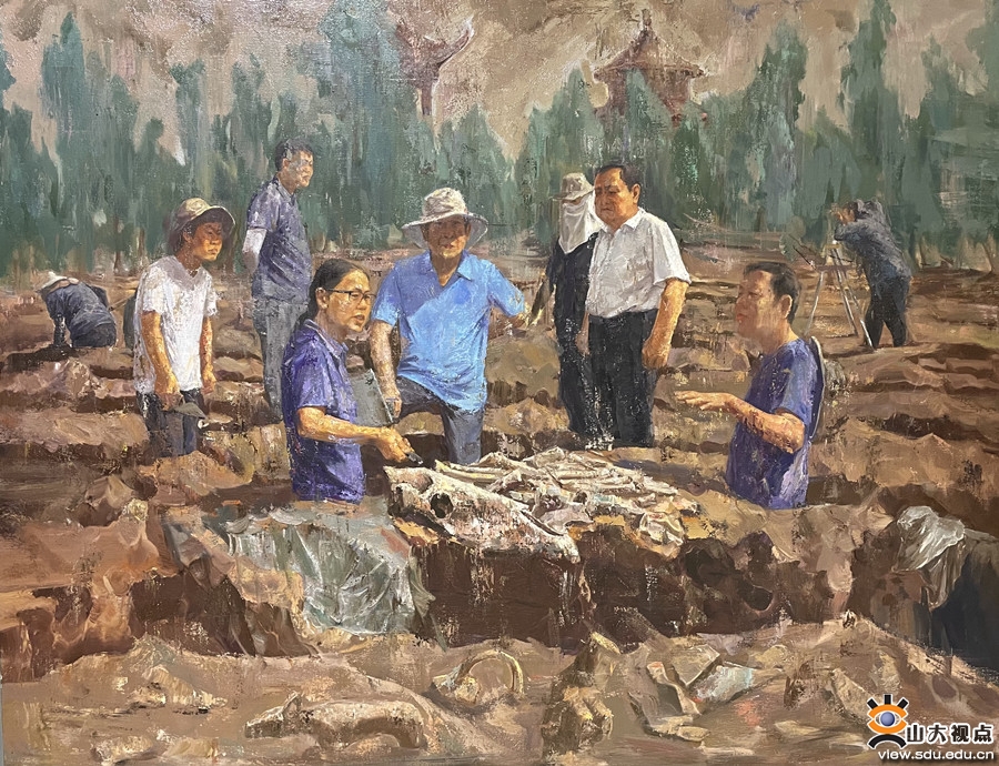 图为《青邱古遗址 一 考古发掘 》,通过对青邱遗址考古现场的实际考察和遗址背景的资料搜集,表达对山大考古人的艰辛付出、科研精神以及丰硕成果的崇高敬意。