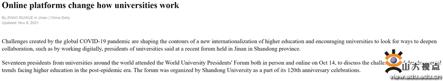 [本站讯]2021年,我们上下一心,科学谋划,奋进前行,顺利完成“十四五”规划设计,精心组织百廿校庆活动,深入实施国际化发展战略。在全球合作伙伴的大力支持下,山东大学全球交流与合作奋楫扬帆、破浪前行。
