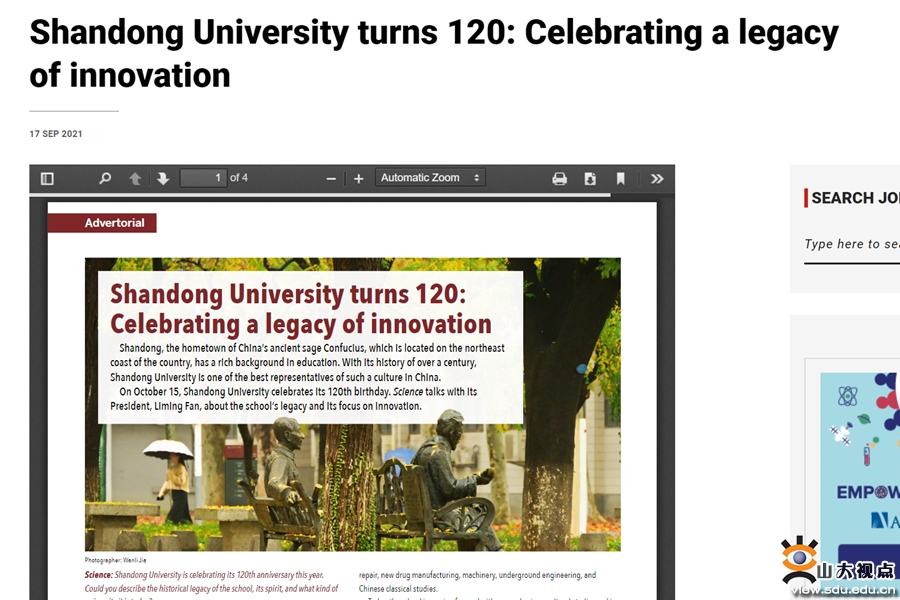 高水准推广。学校与国际著名学术期刊Science合作,推出山东大学校庆专题报道并出版校庆学科发展专题特刊,相关报道推文点击量突破100,000。国际部在学校网站、新媒体平台、部门公众号等发布校庆国际交流系列活动的各类报道10余篇,以校长论坛为主线的国际交流系列活动得到中央电视台、新华社、学习强国、中国教育报、中国日报等20余家中英文主流媒体的持续关注报道。