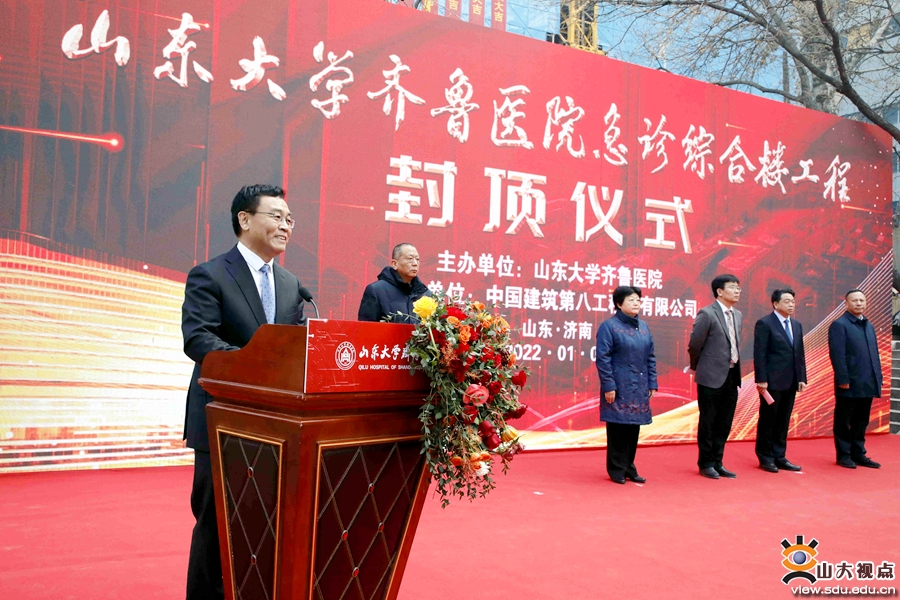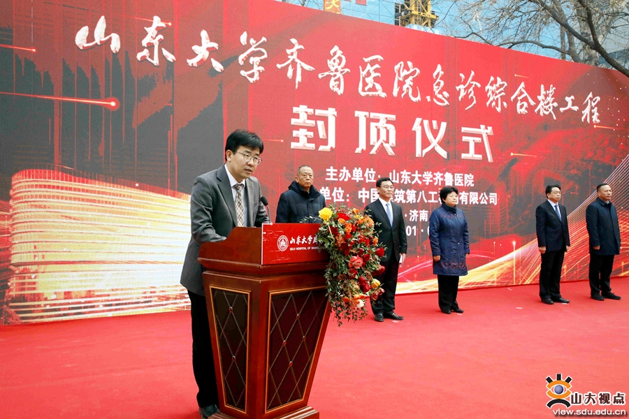 [本站讯]1月9日上午,山东大学齐鲁医院急诊综合楼封顶仪式举行。山东大学校长樊丽明,山东大学副校长、齐鲁医学院院长易凡,齐鲁医院党委书记侯俊平、院长陈玉国,中国建筑第八工程局山东分局党委书记、局长陈建设出席仪式。仪式由侯俊平主持。与会领导、嘉宾共同按下封顶启动球。