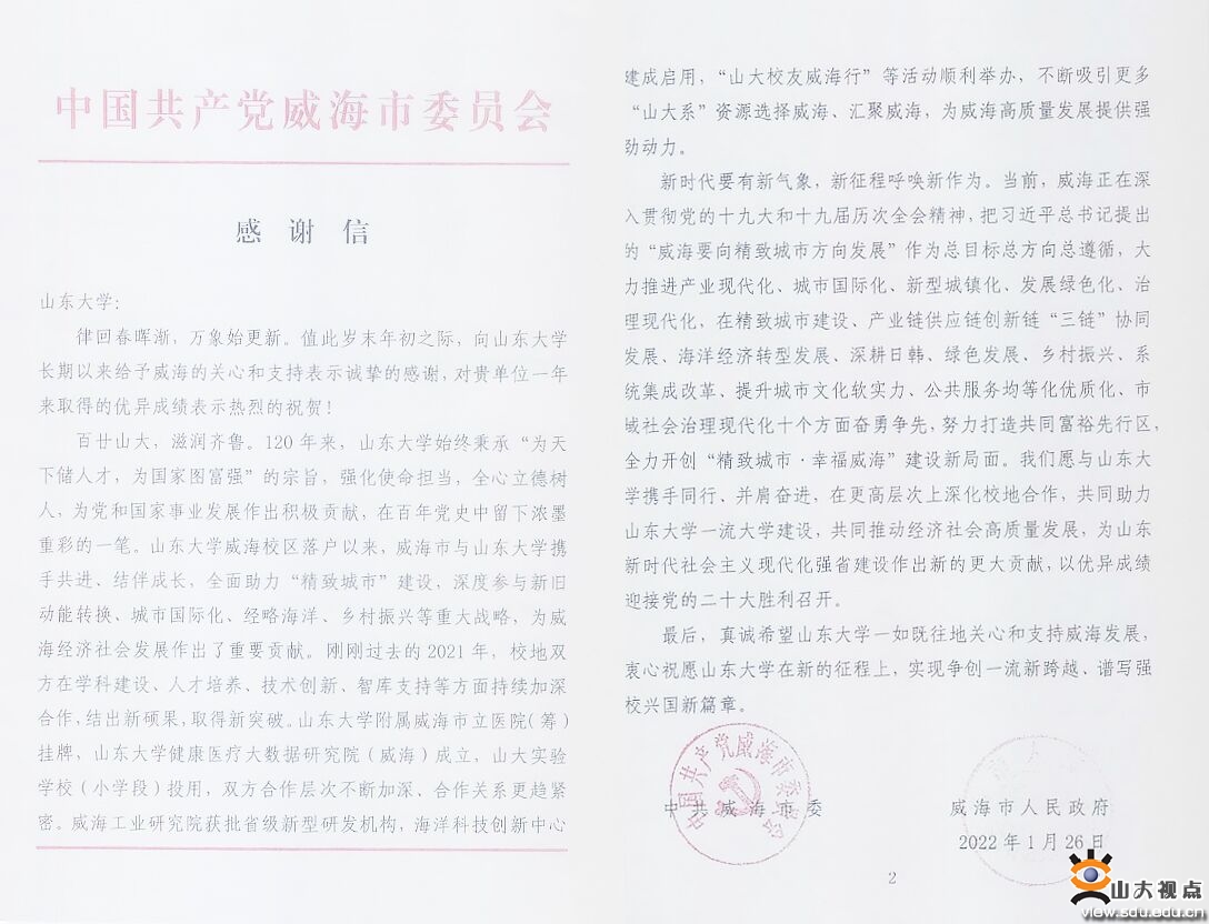 感谢信中提到,2021年,校地双方通过共建山东大学健康大数据研究院(威海)、山大实验学校(小学段)以及开展一系列科研平台建设和合作交流活动,推动双方合作层次不断加深、合作关系更趋紧密,不断吸引更多“山大系”资源选择威海、汇聚威海,为威海高质量发展提供强劲动力。