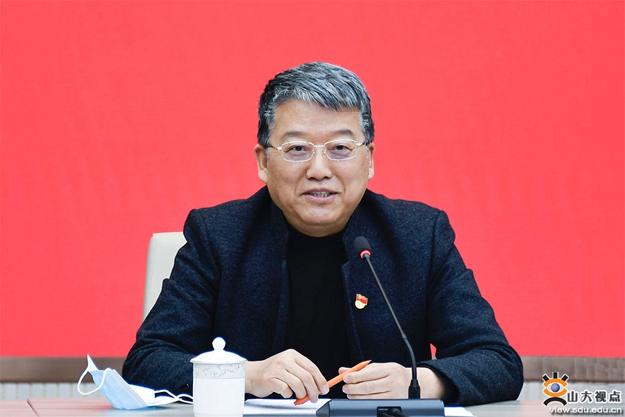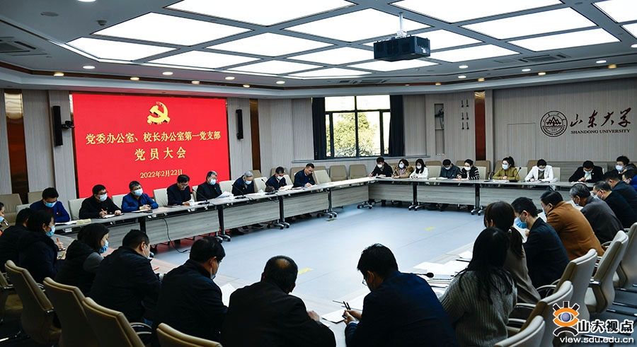 郭新立在讲话中指出,党支部是党在社会基层组织中的战斗堡垒,是党的全部工作和战斗力的基础,加强党支部建设,是发挥党的领导这一最大优势、实现山东大学“由大到强”历史性转变的重要途径。他就如何精耕细作、加强两办党建工作提出要求:一是加强政治建设。以习近平新时代中国特色社会主义思想为指导,增强“四个意识”、坚定“四个自信”、做到“两个维护”,深刻感悟“两个确立”的决定性意义,把政治建设作为统领,不断强化思想建设、组织建设、作风建设、纪律建设,打造让党放心、让师生医务员工满意的模范政治机关。二是加强思想建设。学深悟透习近平新时代中国特色社会主义思想,对习近平总书记重要讲话、重要指示批示精神,特别是习近平总书记关于教育、机关建设等方面的重要论述做到精读细研,切实用“金钥匙”筑牢精耕细作的思想根基,打造始终适应新时代发展需求和学校事业发展需要的模范学习机关。三是加强组织建设。党办、校办是学校中枢部门,在工作全局中具有特殊重要的地位和作用,要以提升组织力为重点,有效凝聚党员思想、力量,团结一条心、拧成一股绳,心往一处想、劲往一处使,协同配合、主动作为,打造筑牢、发挥基层党支部“战斗堡垒”作用的模范攻坚机关。四是加强纪律和作风建设。大力弘扬党的优良传统,把群众观点、群众路线深深植根于思想中、落实到行动上,在不断提高“两不出”质量和水平的基础上,提升支部作风建设层次,帮助老师更好地为学校改革事业贡献力量、帮助学生更好地成长成才,打造为师生医务员工贴心服务的模范担当机关。