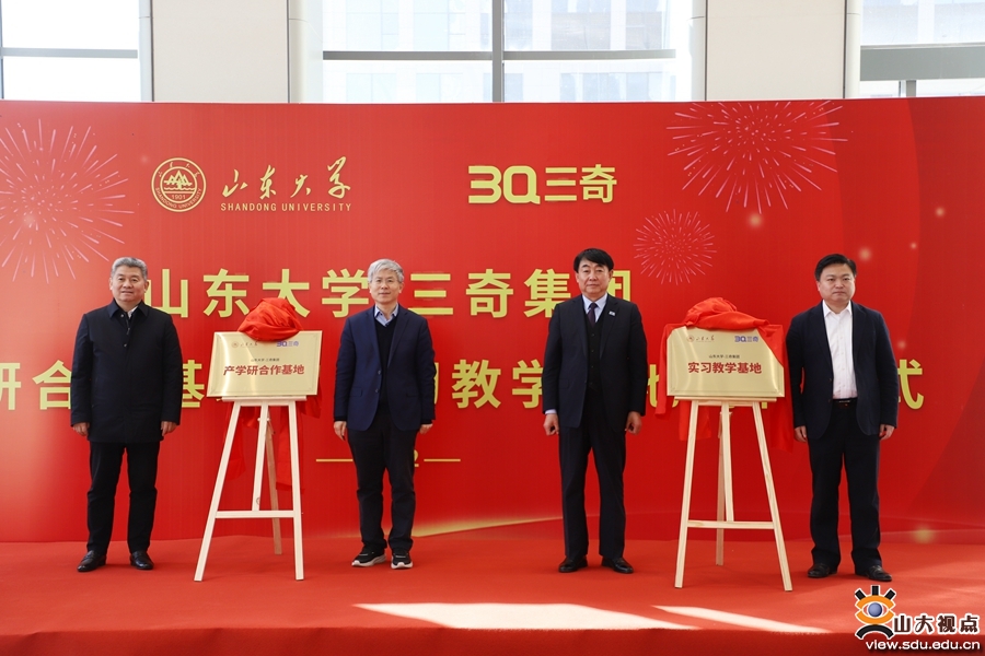 李术才、贾刚、王常申和东港区委副书记、区长何文共同为山东大学与日照三奇集团产学研合作基地、实习教学基地揭牌。
