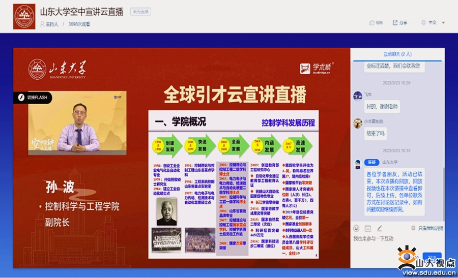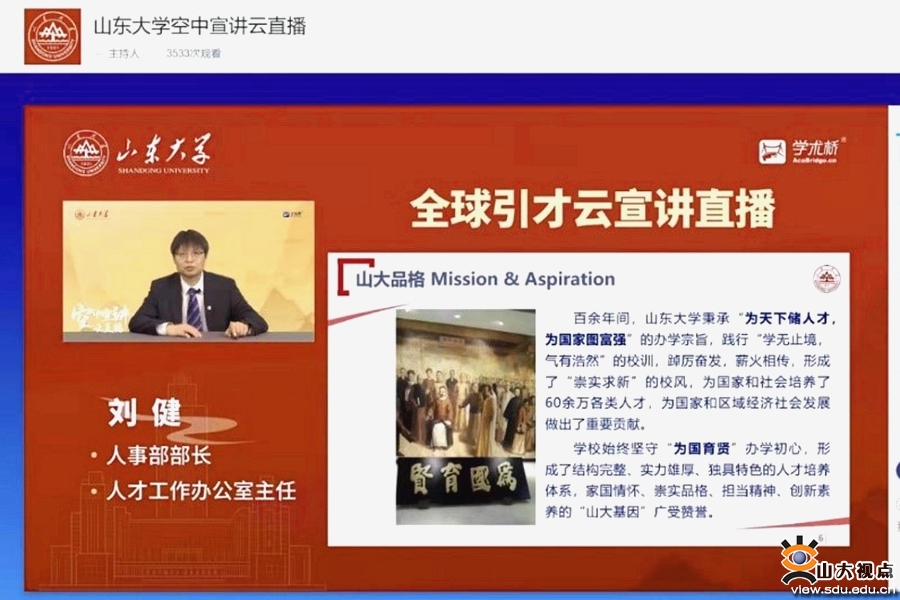 [本站讯]3月23日,山东大学2022全球引才云宣讲直播活动举办。来自海内外16个国家和地区的2500余名学者相聚云端,人事部部长、人才工作办公室主任刘健通过网络直播平台,宣传介绍山东大学基本情况,讲解学校的人才引进政策、成长发展通道和服务保障条件等。本次活动还邀请了山东大学齐鲁医院副院长、人事处处长徐峰和控制科学与工程学院副院长孙波对相关学科平台和人才政策进行介绍。宣讲直播受到参会人员的热烈响应,取得了良好效果。