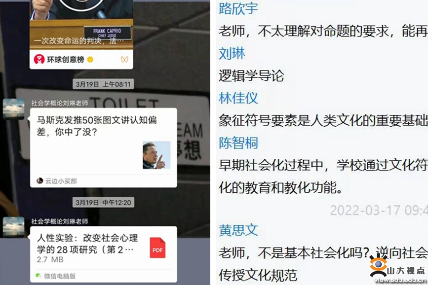 政治学与公共管理学院“社会学概论”课程。为调动同学们的学习热情,刘琳老师会提前在课程微信群分享与当天学习内容相关的视频或文章,帮助同学们尽快进入学习状态。课堂上,组织大家分小组对各自负责的概念进行解释和案例分析。同学们积极参与课堂互动,聊天区评论接连不断,开麦发言井然有序。最后,刘琳老师进行点评总结,指出同学们的亮点与不足,课堂气氛轻松又不失严谨。