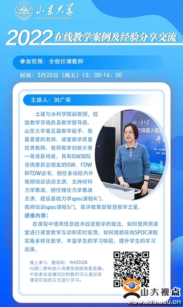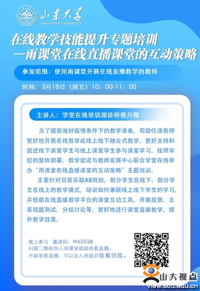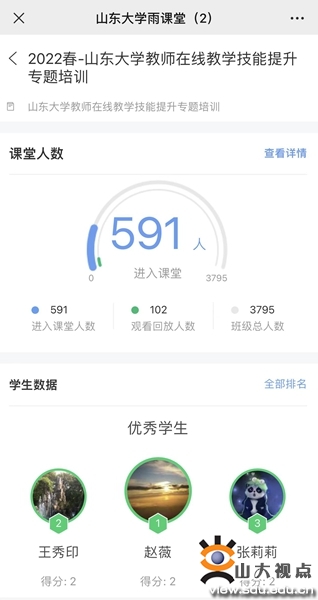 全面提升教师线上教学能力。中心教师发展科搭建在线教学策略创新研讨平台,加大教师线上教学能力培训力度,积极谋划和组织经验交流,持续提升学校教师信息化教学素养和在线教学能力,为全面高效开展线上教学提前做好准备。开学以来,中心先后联合学堂在线举办了“雨课堂在线教学主要功能及操作”“雨课堂在线直播课堂的互动策略”两场主题培训,一校三地近1120名教师实时参加了在线培训,220多名教师通过雨课堂回放参加了学习,进一步提升了雨课堂在线教学互动平台的使用水平。3月25日,中心邀请在线上教学方面有深入研究和长期实践的土建与水利学院刘广荣老师举行了第一期线上教学经验分享,交流了线上教学的经验体会、实用案例、策略技巧和创新做法等,有近百名教师参加了分享。中心还通过中国大学MOOC平台开设了“2022学年春季学期山东大学教师在线教学能力提升研修班”,针对在线教学理论、在线学习设计和在线测评等内容开展培训,同时提供了6位青教赛国赛一等奖获奖教师和5位省赛一等奖获奖教师的参赛视频作为案例,目前已有170多名教师报名参加了研修学习。通过这些培训,学校教师的信息化教学素养得到提升,有力保障了线上教学的质量和效果。