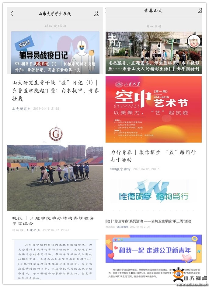 学校坚持五育并举,将德智体美劳教育贯穿抗疫行动全过程,开展系列线上线下活动,丰富学生日常生活,多层面精准部署、多形式营造氛围、多举措宣传引导、多渠道畅通延伸,积极引导广大青年学子弘扬正能量,化“疫情防控”为“育人良机”。充分发挥学生在线、青春山大、山大研究生等新媒体矩阵的价值引领优势,提炼疫情防控中的先进事例和生动故事,深入挖掘提炼思政育人元素,策划形式多样的主题教育活动,做好疫情防控期间舆论引导和宣传教育工作。土建与水利学院不断推进教育提质增效工作,举办本科生结构大赛经验分享交流会、力学云答疑、专利申请专题讲座,助力学生科研创新水平提升,保障科研“不断线”;组建多样学业互助小组,成立高年级学生党员讲师团、班级内部学习小组,“帮着学”“带着学”“集中学”,保证全员不掉队。能源与动力工程学院开展系列体育活动,组织趣味运动会,提升学生参与度和凝聚力,丰富学生课余活动;开展微信捐步“益”路同行活动,鼓励学生走出宿舍进行运动,将运动与公益相结合,弘扬公益精神。艺术学院学工队伍和留校教师共绘美育同心圆,精心筹备系列校园文化活动,把艺术节搬上“云端”,开展山东大学空中艺术节,通过空中讲座、空中艺术展、校外线上展览演出等不同形式,用艺术之美抚慰人心、凝聚人心,以美育引导学生积极乐观面对当下学习生活。公共卫生学院举办“劳卫青春”手工艺品创作设计大赛,鼓励学生集思广益、就地取材,充分利用日常生活中的废弃材料制作创意作品,变废为宝,在丰富校园文化生活的同时,提升学生的动手能力和劳动意识。