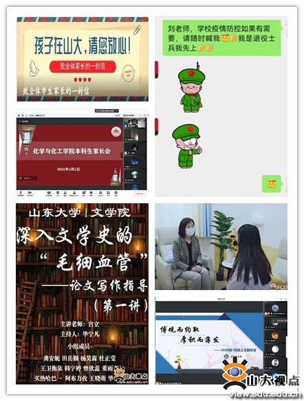 学工系统全体人员坚持以学生为中心、与学生在一起,守望相助,共克时艰,用实际行动服务广大学子,以关心送信心、以热心送信任、以全心送信念,全力保障在校学生的安心学习和舒心生活,以心共情、共克时艰。就业创业指导中心举办系列毕业生春季空中双选会,开展在线招聘等系列活动,确保校园招聘不断线、招聘活动不打烊,助力毕业生更加充分更高质量就业。学生资助中心切实做好疫情防控期间学生资助工作,开展家庭经济困难学生认定动态调整工作,确保及时足额发放各项资助资金,提供专项困难补助,保障对因疫致困、因疫返困、患病或家庭发生重大变故学生的及时救助,坚持扶困扶智扶志相结合,激励学生直面困难、自强自立。学生公寓管理服务中心工作人员及众多学生党员、志愿者承担起济南六个校区33000余名学生的住宿和服务工作,严格落实学校消毒专项工作要求,全方位、无死角做好消杀工作,发放消毒液等防疫物资,及时解决学生实际需求和现实困难,切实保障校园封闭期间学生权益,做到学生有所呼、学校必有应、难题必有解,让学生感受到“隔离病毒但不隔离爱”的温情,为学生打造守望相助的温馨家园。外国语学院坚持解决思想问题与解决学生实际困难相结合,全力做好学生管理服务和关心关爱工作,为需要冷藏药品的学生购置冰箱,为紧急就医的学生收拾行李,帮助长期服用中药的学生进行线上问诊开方,关心酒店隔离学生的生活与心理状况。材料科学与工程学院校外工作组教师志愿者代替学生到医院挂号、就诊、取药、送药,为在校学生身体健康提供有力保障。经济学院实施“暖心工程”,通过全覆盖式学生宿舍走访、开展师生畅谈会等形式多层次、多场域、多举措调研学生需求、解答学生疑惑,将关爱与帮助精准送到学生心坎上,在学院教育基金的赞助下,为全院在校生发放新鲜水果,以实际行动彰显人文关怀。