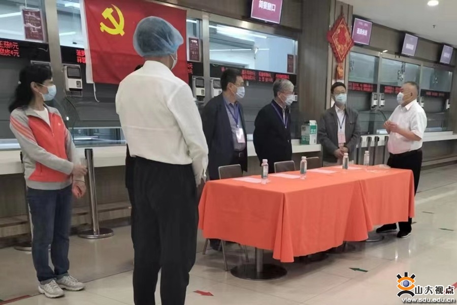 [本站讯]4月21日晚,副校长李术才、吴臻到千佛山校区舜园餐厅参加餐饮部临时党支部主题党日活动。