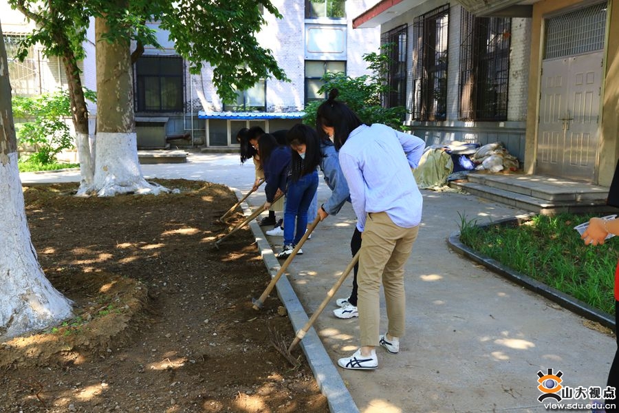奉献劳动吹号角,五育并举正青春。洪家楼校区以学院为单位“划区分片”落实各团支部劳动教育项目推进,引导学生对本学院的责任卫生区域进行环境卫生、行为秩序的维护和管理,保持责任区域内的环境整洁,排查安全隐患。各学院也在负责的区域内开展特色化的劳动教育项目,相互间传授高效实用的劳动技能,表彰鼓励劳动先进个人与先进集体,让劳动春风吹拂整个校园。外国语学院学生依托所分片区开展清扫校园活动,志愿者们细心打扫小树林里的每个角落,在教学楼内整理桌椅,擦拭楼梯扶手和雕像。