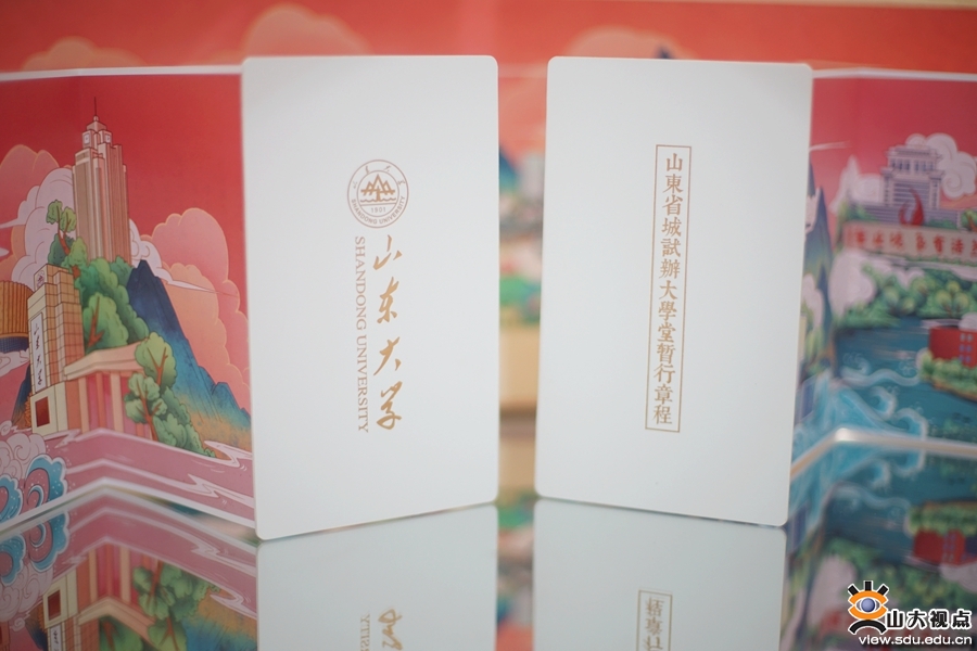 随录取通知书一起寄送的还有风琴折页和报到须知书签。缓慢铺开的风琴折页如同历史长卷,诉说自1901年起的深厚底蕴。折页正面是《山东省城试办大学堂暂行章程》, “正心术、敦品行、明伦理、知大体”出自章程第三章第七节,这十二字箴言寄语新时代的山大人,希望青年们加强道德修养,明辨是非曲直,增强自我定力,努力追求更有高度、更有境界、更有品位的精彩人生。山东大学办学宗旨出自章程第三章第八节,“公家设立学堂,是为天下储人才,非为诸生谋进取;诸生来堂肄业,是为国家图富强,非为一己利身家”,充分体现了学校自创办以来就具有的争创世界一流水平、担负民族复兴使命的追求。折页背面是设计精巧的山大校景图,山魂海韵,山海相依,正当读书好去处。折页封皮由1400克的五层特种纸压制而成,烫复古哑金,华丽之中不显喧嚣,留白里多几分沉稳。