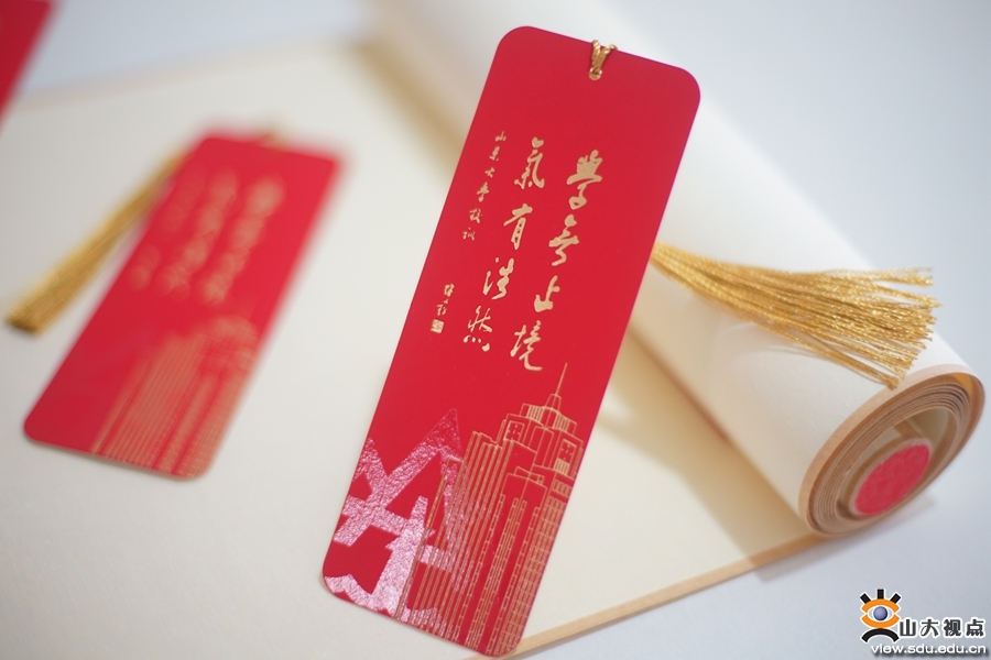 报到须知书签正面是熟悉的山大红,“学无止境,气有浩然”,烫金印制的校训激励广大师生在学术和人生的历程中勇于登攀,高高矗立的知新楼是描绘于山大人心中的专属符号。反面印有报到须知二维码,扫一扫,获知校园的讯息,提前做好入校前的各项准备。