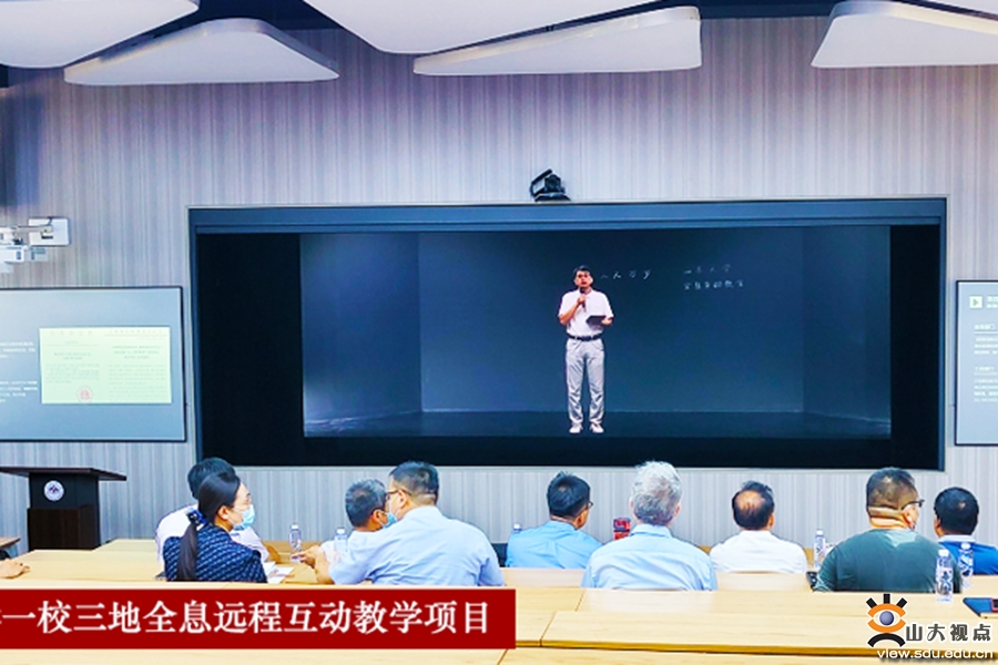 [本站讯]由山东大学和中国银行山东省分行联合建设的“山东大学一校三地全息互动教室”项目近日竣工。学校邀请来自省内多所高校和校内相关单位的十多位专家,在中心校区董明珠楼召开项目验收会。经过承建单位汇报、现场效果展示和设备情况考察,专家组认为该项目达到了所有技术指标,同意项目通过验收并交付使用,成为全国首家在高校建成并投入使用的全息互动教室。