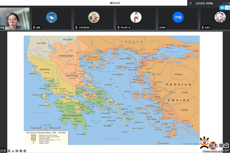 考虑选课学生知识储备水平的不同,岳梦臻老师精心准备了多样趣味化的课程选材。从《荷马史诗》的原文阅读到希腊移民的城邦地图,从记载了希波战争的壁画到帕特农神庙复原的石柱,岳梦臻老师以丰富而生动的课程内容带领同学们从宏观视角俯瞰古希腊罗马世界的历史脉络。对于此,外国语学院的尹照洛分享了自己的感受:“课堂上,老师以当时普通雅典公民的视角展示了雅典卫城的3D复原动图,这给了我一种身临其境的感觉。”来自国际教育学院的蔡顺茗深有同感:“虽然是隔着屏幕在上课,但是我们能真切地感受到老师的用心。”