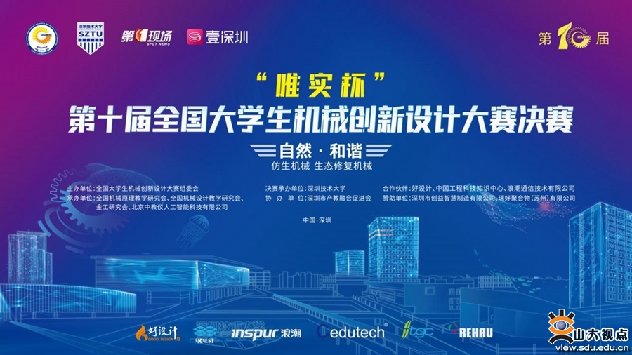 [本站讯]8月21日至23日,“唯实杯”第十届全国大学生机械创新设计大赛在深圳举行。山东大学学子在比赛中表现出色,经山东赛区选拔推荐的山大4支竞赛队伍全部获奖,其中:李铭超、范卓轩、胡敖坤、杨子洁、宋思怡团队的作品(指导老师:杜付鑫)荣获一等奖;宋笑语、杨伯骏、袁理想、伍凯、王昊诚团队的作品(指导老师:刘甜甜、霍志璞)荣获二等奖;王鸿辉、李旨江、张鹏、程昊、王坤艳团队的作品(指导老师:杜付鑫),李志华、韩瑞、田立信、张容瑄、季俊方团队的作品(指导老师:霍志璞、梁西昌)荣获三等奖。孙康宁教授荣获杰出贡献奖。