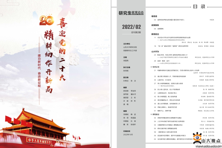 新刊设有“政策聚焦”“教育前沿”“山大作为”等栏目,集中传递党和国家对建设教育强国,培育支撑高水平科技自立自强后备军的要求。教育前沿部分,刊发博士生导师李术才教授等人的文章,基于山东大学专业学位研究生教育的实证调研数据,提出综合性大学培养高端行业应用型人才的思考。“山大作为”部分,本期推出学校面向国家急需,整体部署超常规培育拔尖创新人才的各项举措。新的子栏目“导师论导”,汇集了11位导师科研报国、躬耕桃李的故事。学为人师,行为世范,经济学院导师石绍宾教授回忆说:“我至今都记得曾经导师在文章初稿上满篇的红字意见,一针见血的批评让我倍感汗颜,也指出下一步改进的方向。”匠心育人,砥志研思,机械工程学院导师刘战强教授说:“育人和科研其实完全不对立,而是集成统一的。”励学笃行,苦练本领,物理学院导师秦伟教授说:“如果你不是智商超群,就要和别人竞赛时间。”在新设子栏目“课程建设”中,选取了软件学院、新闻传播学院等培养单位在数字化、智慧化课程建设方面的创新作为。