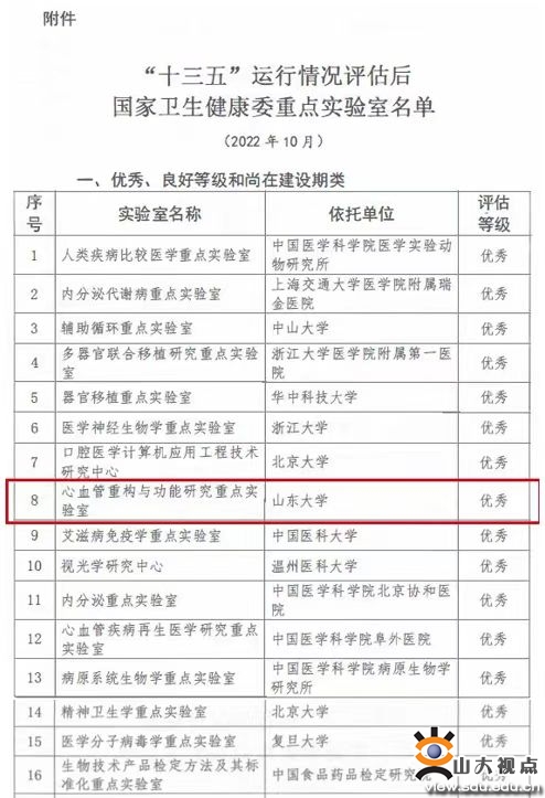 [本站讯]近日,国家卫生健康委办公厅公布了委级重点实验室“十三五”运行情况的评估结果,山东大学心血管重构与功能研究重点实验室获评优秀,在16家优秀等级的实验室中位列全国第八。