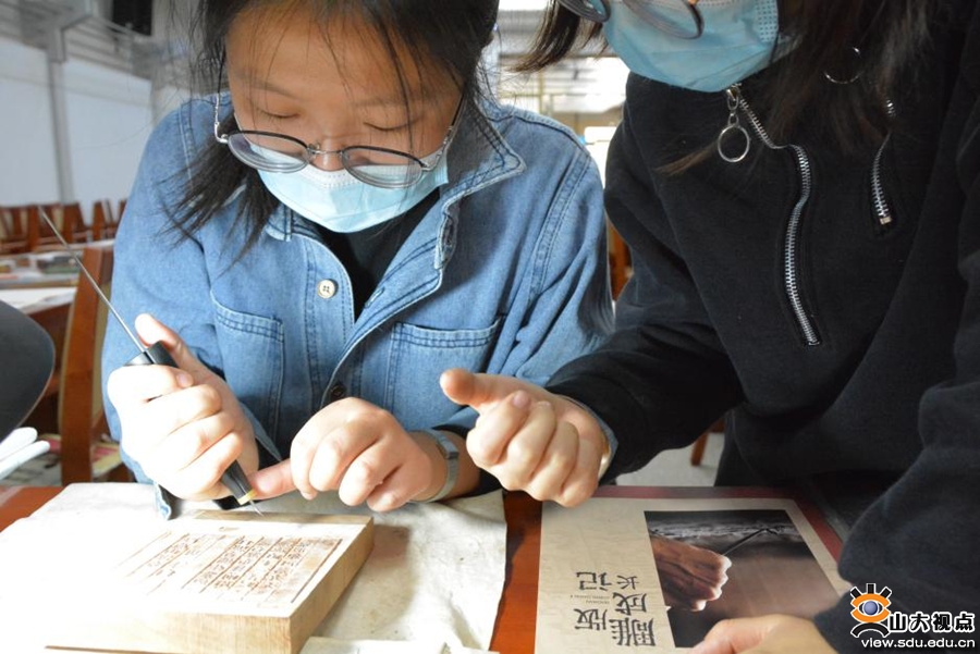 活动现场,李振豪向师生详细介绍了雕版的发展历史、制作流程和技艺特色。现场精美的活字版、饾版、拱花版等数十种雕版实物,让在场师生感受到了雕版的艺术魅力,对雕版印刷这一古老的技艺有了更深的认同感。来自文学院、儒学高等研究院的学生在参观雕版实物时纷纷表示,雕版中蕴藏了大量的版本信息,挖补、拼版等现象有时在成书中难以发现,而雕版实物则为版本鉴定提供了直接的参考依据。专业雕版刻工向大家演示雕刻的技法,握刀要稳,下刀要准,走刀要流利,每一次落刀的手法、形式需随笔画走势变化。在老师指导下,同学们尝试了挑刀,体悟到了一笔一划一刻刀背后的匠心。