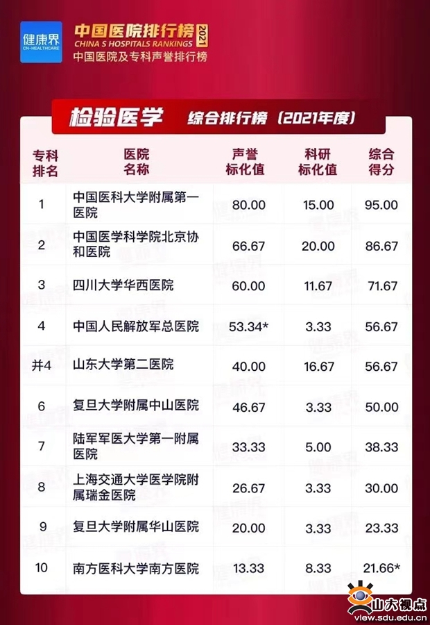 [本站讯]11月20日,复旦版《2021年度中国医院综合排行榜》和复旦版《2021年度中国医院专科声誉排行榜》发布,山东大学第二医院检验医学中心荣登检验医学专科综合排行榜第4名(并列),这是继2020年获专科声誉榜第8名后又一新的突破。同时,医院传染感染科、康复医学和变态反应等学科获华东地区专科声誉排行榜提名。
