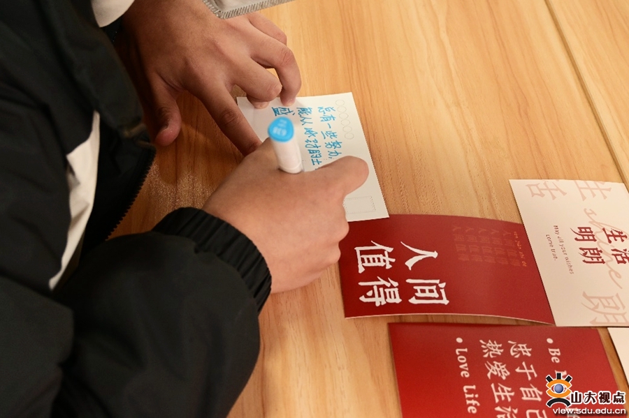 活动分为两个阶段。第一阶段为撰写环节,心理协会的会员们用自己喜欢的形式,在精美的明信片上落笔,让爱通过书写的方式在纸面流淌。有人在卡片上留下一句暖心的话语,祝愿收信者能成为自己心中的光,自信坦荡;有人耐心地在卡片上写下一段长长的抒情文字,与守护校园的山大人共情,光芒万丈;还有人用彩笔在卡片上画上爱心和鲜花,让绚烂的色彩成为青春的底色,肆意张扬。隽永的字体,美好的图画,64张明信片被轻轻地投进箱子里,混合着甜甜的糖果和巧克力,等待温暖的传递。