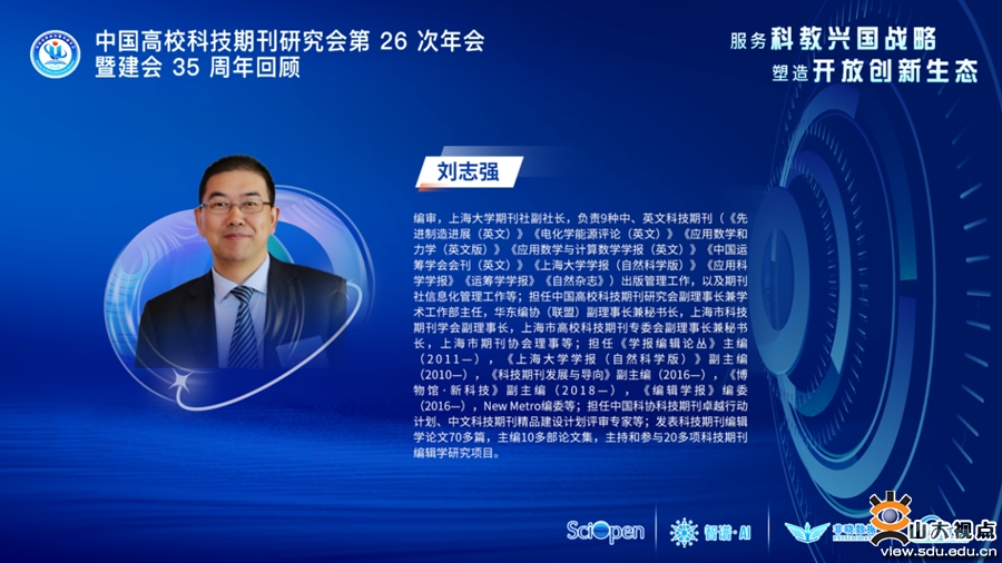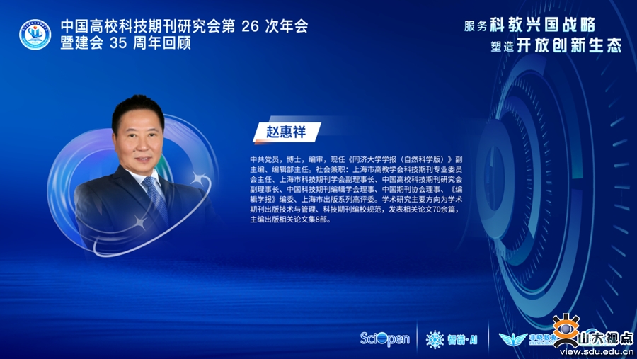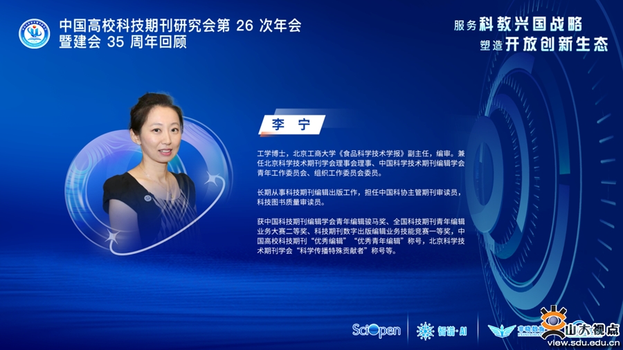 [本站讯]为深入学习贯彻党的二十大精神,落实《关于深化改革培育世界一流科技期刊的意见》和《关于推动学术期刊繁荣发展的意见》文件精神,加快高校科技期刊建设水平,全面提升期刊编辑素养,更好地服务“双一流”建设,中国高校科技期刊研究会于2022年12月1—3日举行第26次年会暨建会35周年庆祝会议,山东大学科技期刊社承办本次年会“服务技术创新”分论坛。会议邀请了研究会副理事长赵惠祥、刘志强作为致辞和点评嘉宾,《食品科学技术学报》副主任李宁、《净水技术》执行主编阮辰旼、AMiner学术服务中心主任刘丽授课。山东大学科技期刊社社长、出版社社长,中国高校科技期刊研究会技术专委会主任委员陈斌主持会议。