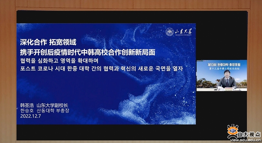 [本站讯]12月7日,第十三届中韩大学校长论坛以线上线下结合的方式举行。山东大学副校长韩圣浩出席论坛并作题为“深化合作 拓宽领域 携手开创后疫情时代中韩高校合作创新新局面”的主题发言。