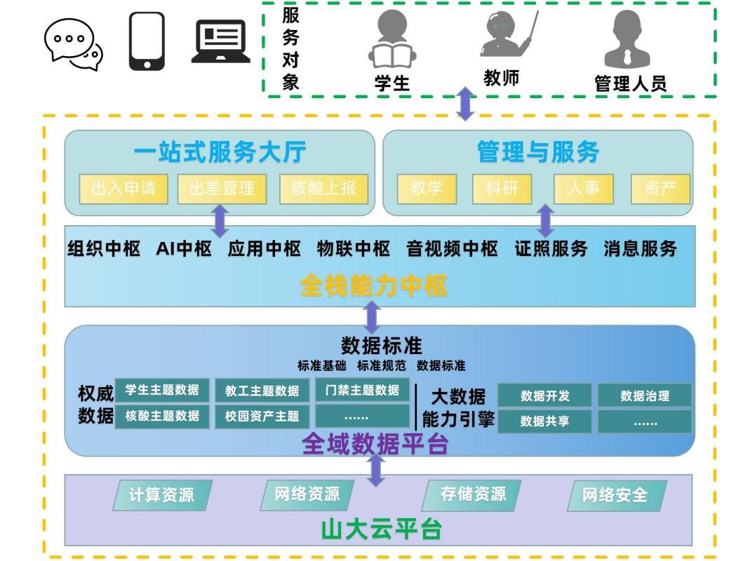 山东大学充分利用信息化手段支撑疫情防控工作,做好学校疫情防控各阶段信息化保障预案,建立健全疫情防控科学精准的信息化支撑体系;依托学校“1+1+1+N”(即1个全域数据平台,1个全栈能力中枢,1个一站式服务大厅与N个管理与服务领域,)的信息服务总体框架,构建覆盖核酸检测、人员摸排、学生报到(返乡)、校园管控、心理辅导、信息发布等疫情防控各方面全流程全闭环管理的服务体系,并提供精准数据支持。