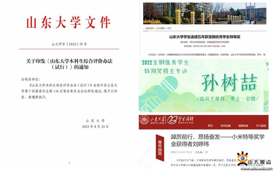 8月24日,《山东大学本科生综合评价办法(试行)》印发,本着“五育并举”的原则,力促德智体美劳相互渗透、有机结合,通过树立目标、明确导向,推动学生总结阶段性成长历程,促进学生全面发展和成长成才。