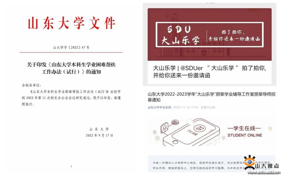 9月17日,《山东大学本科生学业困难帮扶工作办法(试行)》正式发布,积极推进学校学生学业发展指导中心建设,构建校院两级、多维度的学业指导和帮扶体系,建立多部门协同工作机制。26个学院学业帮扶项目通过立项,成立并运营“大山乐学”朋辈辅导工作室,发挥学科优势开设“名师公开课”。