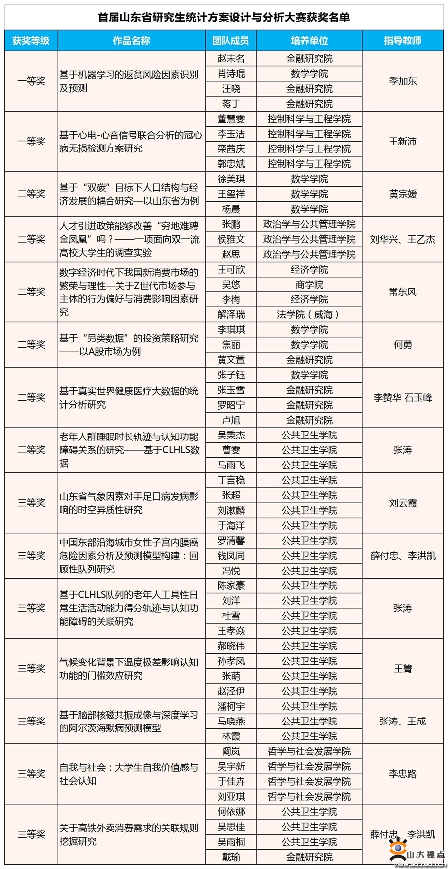 [本站讯]近日,首届山东省研究生统计方案设计与分析大赛总决赛举行。山东大学获一等奖2项、二等奖6项、三等奖7项,获奖率列全省首位,获优秀组织奖。