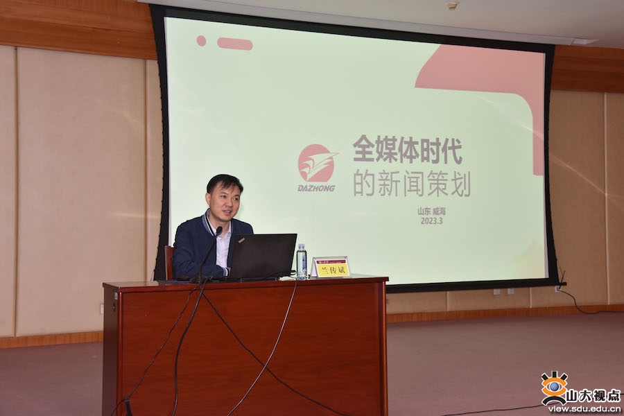 3月4日上午,文化传播学院副院长张超、大众日报新媒体运营中心主任兰传斌分别作题为“讲好中国故事、山大故事,提升国际传播能力”“全媒体时代的新闻策划”的报告。张超教授在报告中对国际传播能力的含义作了全面阐释,从话语融通、内容转化、精准分发、用户分析、议程设置等五个方面,分析了当前国际传播能力建设存在的问题,并结合具体案例,从讲事实说服人、讲形象打动人、讲情感感染人、讲道理影响人等角度,提出了如何讲好中国故事、山大故事,提升国际传播能力的对策建议。兰传斌结合丰富鲜活的新闻案例解读了媒体融合发展趋势下全媒体策划的若干形态,着重介绍了全媒体传播的五种思维方式和四种操作手法,并从技术、内容、创意、用户等方面剖析了全媒体策划的四种驱动方式,帮助大家掌握拓展推进全媒体策划的方式方法。