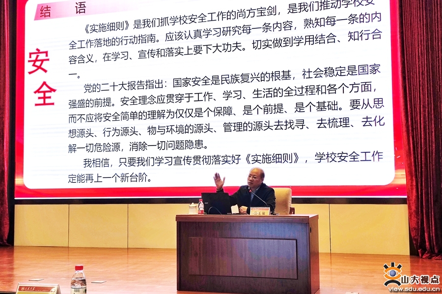 邱玉敏对《实施细则》的制定背景、政策依据、创新亮点、主要内容四个方面进行了详细解读。他谈到,《实施细则》的出台以全省教育系统安全管理实际为依据,以上级批示指示要求为导向,以已有学校安全管理法规情况为参考,是在充分实地调研、广泛征集意见、大量分析论证的基础上,以省政府名义制定的学校安全管理规定。《实施细则》利用11章104条13215个字,在职责界定、宣教培训、事故防范、安全管理、周边管理、督导检查、应急处置、保障机制、考核追责等方面全面强化教育系统各层级、全过程安全管理,较之《山东省学校安全条例》内容更加全面细致、各方责任更加明晰、体系更加清晰规范、适用性操作性更强、校园安全举措更实、追责问责更加具体,有利于充分发挥“政府负责、社会协同、属地管理、综合治理”的学校安全工作原则,提高基层操作的便利性,推动学校安全管理责任落细落实。