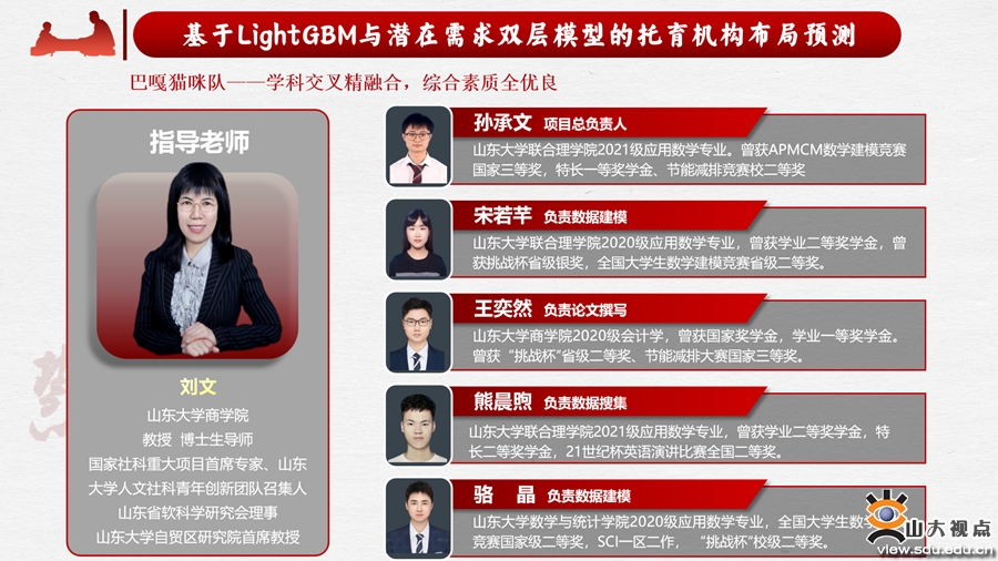 山东大学获奖队伍来自三个校区多个专业。山东大学澳国立联合理学院“巴嘎猫咪队”的《基于LightGBM与潜在需求双层模型的托育机构布局预测——以上海市为例》获全国一等奖;由山东大学哲学与社会发展学院与西安交通大学、南京理工大学的学生组成的交叉合作团队“好好学习队”的《基于手机信令数据的春节期间中国城市人口时空分布研究》获全国三等奖和优秀指导教师奖;由商学院、数学与统计学院学生组成的“最起码数据队”作品《后疫情时代基础教育阶段互联网学习体验感研究》获全国优秀奖;计算机科学与技术学院的“ecoda分析的都队”作品《基于内容推荐与协同过滤的图书馆个性化推荐系统》获全国优秀奖。山东大学哲学与社会发展学院教授宋全成获优秀指导教师奖。