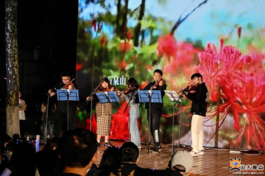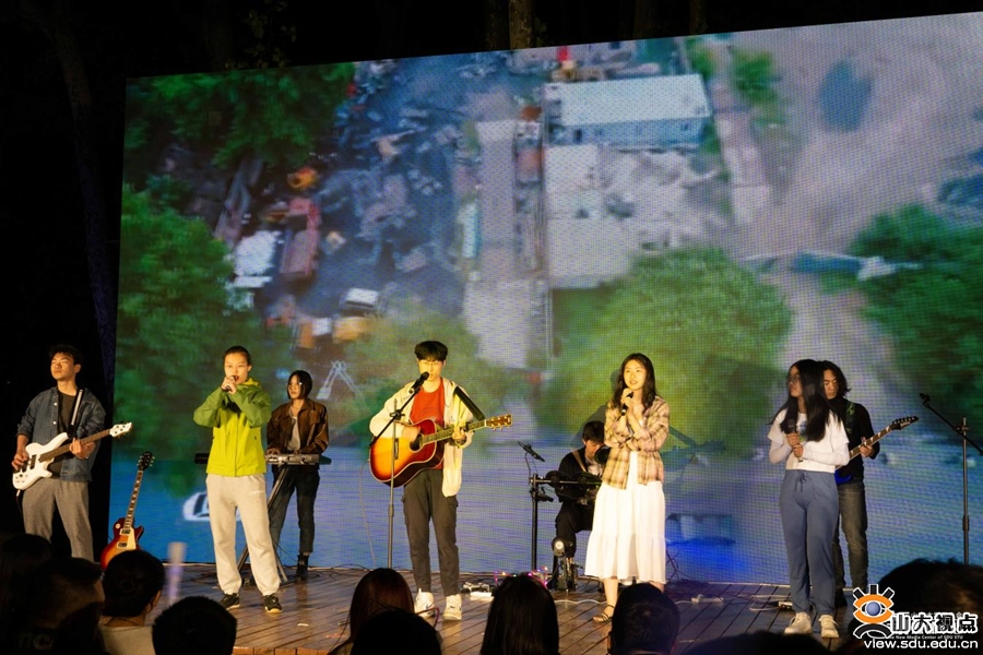 吉他悠扬,鼓点激昂。《再见再见》《再见杰克》《带我去找夜生活》《yellow》《love yourself》《一万次悲伤》……一首接一首,山东大学学生吉他协会、山东大学学生创新创业协会、山东大学学生自行车协会、山东大学学生国际交流协会以乐队演唱、双人弹唱等形式进行表演。