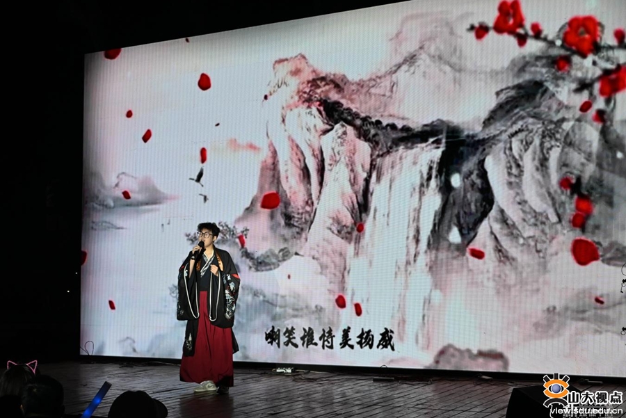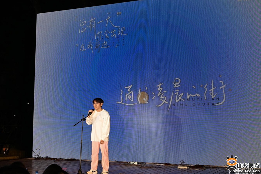 独唱也深情。山东大学学生魔方爱好者协会、山东大学学生尼诺剧社、山东大学学生吉他协会的周学敏、林颙颜和国显烨同学分别带来了《总有一天我会出现在你身边》《牵丝戏》《第几个一百天》《想见你》等歌曲独唱,婉转深情,触人心弦,给晚会带来了别样韵味。