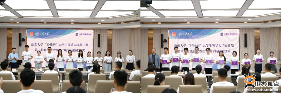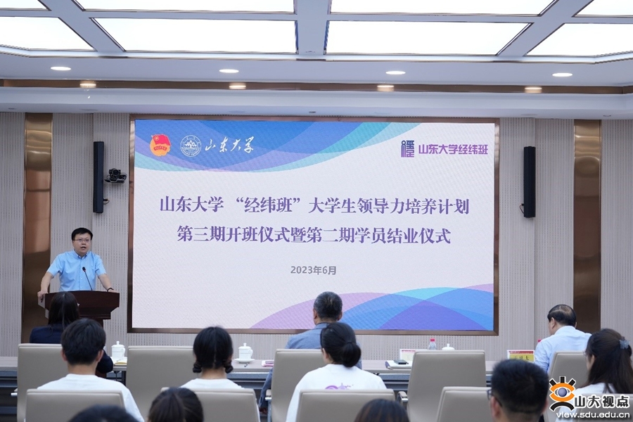 [本站讯]近日,山东大学第三期“经纬班”大学生领导力培养计划开班仪式暨第二期学员结业仪式以线上线下相结合形式在一校三地同步举行。校党委副书记王君松、道得投资管理有限公司董事长武飞出席会议。