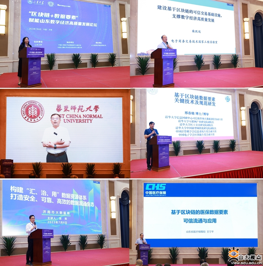 新加坡工程院院士、新加坡南洋理工大学计算机科学与工程学院院长苗春燕,科技部现代服务业总体专家组组长、清华大学电子商务交易技术国家工程实验室主任柴跃廷,华东师范大学副校长周傲英,清华大学教授邢春晓,国家信息中心信息化和产业发展部主任单志广分别就“人工智能及区块链人才培养”“建设基于区块链的可信交易基础设施,支撑数字经济高质量发展”“区块链的重要意义和发展路径”“基于区块链数据要素关键技术及规范研发”“区块链与数据要素价值化”作主旨演讲。济南市大数据局党组书记、局长张熙作“构建汇、治、用数据资源体系,打造安全、可靠、高效数据流通生态”案例分享,山东省医疗保障局规划财务处副处长王守平作“基于区块链的医保数据要素可信流通与应用”案例成果分享。黄河住房金融研究院、山东省医疗保障局、山东省人社厅、威海市大数据中心、华东师范大学、山大地纬等相关负责人、专家分别进行了案例成果分享和学术交流。