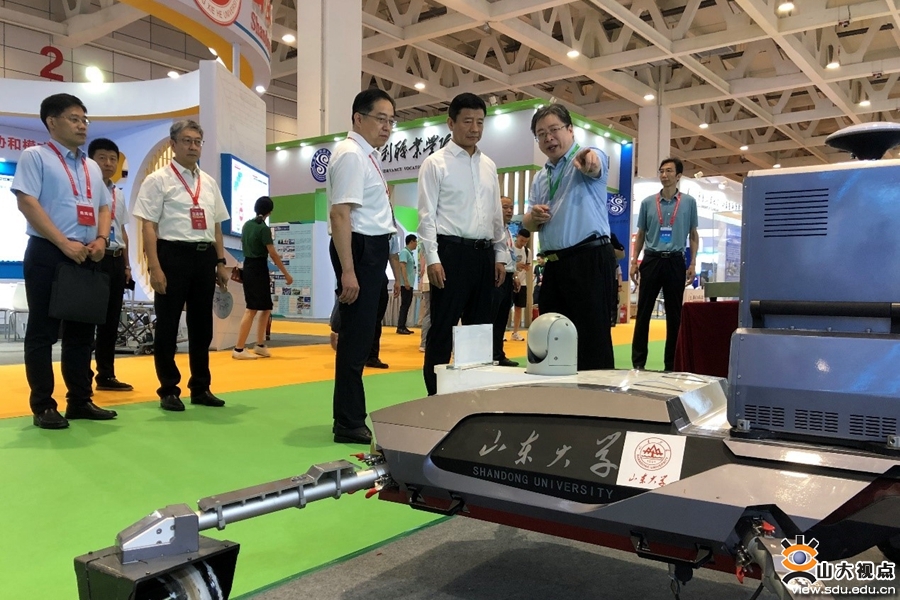 山东大学在第一届山东省创新创业教育成果展演中设置了最大展位,设计了双创理念文化展示区、双创成果实物展示区、双创合作交流区等。双创展演系列活动由山东大学创新创业学院/国际创新转化学院副院长邢建平带队,集聚盾构机装备团队、术后恢复检测装备、芯合机器人、编程猫、卷积通信、北斗精准新时空、光电器件芯片及普源精电仪器系统等一批优质的往届互联网+国金/国银项目、校内项目、校友企业及官方合作企业作品和产品。山东省委教育工委常务副书记、省教育厅党组书记、厅长李明莅临山东大学展演区,与项目团队交流,肯定了山东大学双创教育工作。