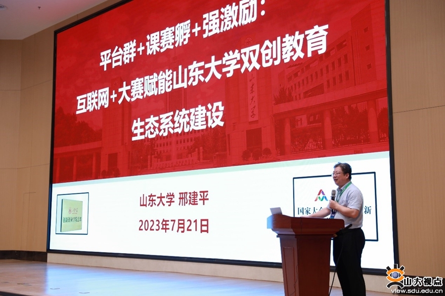 在第一届山东省创新创业教育高质量发展系列论坛(校长论坛)中,来自省内7所高校的嘉宾作双创教育主题报告。邢建平主持论坛并作题为“平台群+课赛孵+强激励:互联网+大赛赋能山东大学双创教育生态系统建设”的报告,分享山东大学率先把创新创业教育贯穿人才培养全过程,以赛提高学生双创核心素养、实践能力和国际竞争力,在创新实践中赋能于最优秀的本科生、最具创造力的研究生培养,为建设创新型国家提供人才智力支撑的相关经验。在第一届山东省创新创业教育高质量发展系列论坛(基地建设论坛)中,山东大学创新创业学院院长助理陈言俊分享主题报告“赢创山大创新创业教育、国家级双创示范基地的建设与实践”。报告指出,打造完善的双创教育体系要结合理论研究、能力培养、实训实践、平台基地等四个方面,全力支持保障双创教育生态系统。报告分享了山东大学在创新创业发展上的相关做法,指出学校采取一校三地本研一体、资源共享、结构合理、布局科学、特色鲜明、优势凸显的培养模式,科学评价和长效激励机制更加健全,本研一体、跨校区、多学科共建共享运行更加高效服务师生,双创教育与实践环境更加优越。