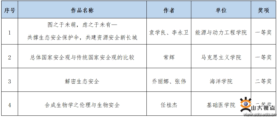 [本站讯]近日,山东省教育厅发布《关于公布2023年国家安全宣传教育优质课例评选结果的通知》,山东大学4项课例入选国家安全宣传教育优质课例,其中一等奖2项,二等奖2项,同时,山东大学获评国家安全宣传教育优秀组织单位。